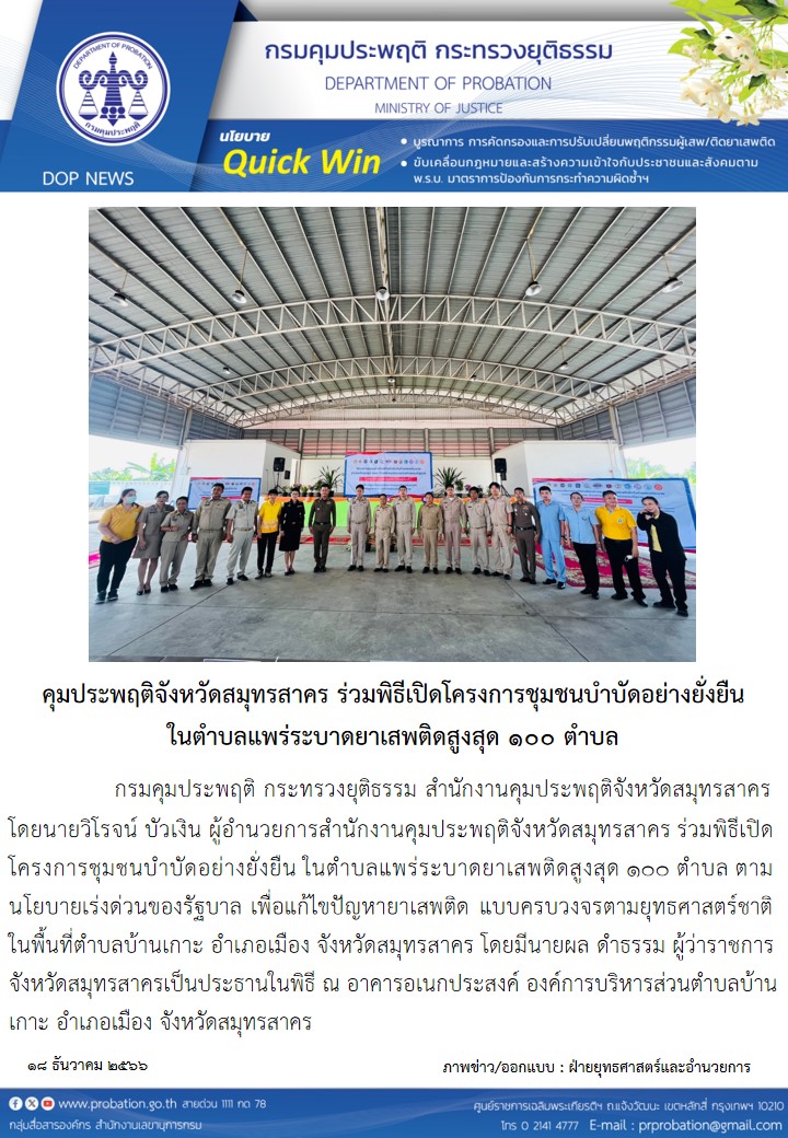 คุมประพฤติจังหวัดสมุทรสาคร ร่วมพิธีเปิดโครงการชุมชนบำบัดอย่างยั่งยืน ในตำบลแพร่ระบาดยาเสพติดสูงสุด 100 ตำบล