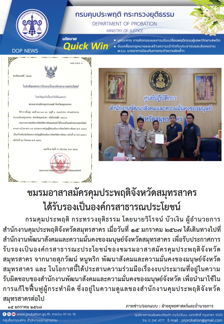 ชมรมอาสาสมัครคุมประพฤติจังหวัดสมุทรสาคร ได้รับรองเป็นองค์กรสาธารณประโยชน์