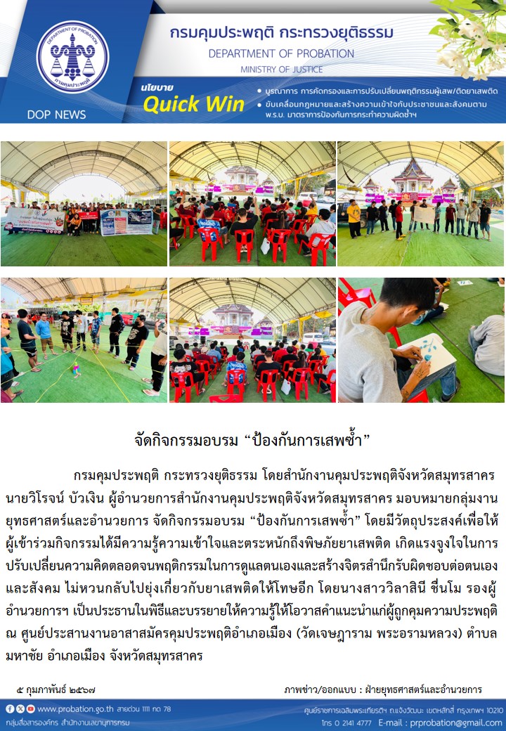 กรมคุมประพฤติ กระทรวงยุติธรรม โดยนายวิโรจน์ บัวเงิน ผู้อำนวยการสำนักงานคุมประพฤติจังหวัดสมุทรสาคร จัดประชุม WORK SHOP ขั้นตอนการปฎิบัติงานของอาสาสมัครคุมประพฤติในพื้นที่ อำเภอเมืองสมุทรสาคร เพื่อให้อาสาสมัครคุมประพฤติ ซึ่งได้รับการคัดเลือกและได้รับการแต่งตั้งรุ่นใหม่ เข้าใจถึงขั้นตอนการทำงานในฐานะอาสาสมัครคุมประพฤติ โดยมีประธานอาสาสมัครคุมประพฤติอำเภอเมืองสมุทรสาครและคณะกรรมการบริหาร เข้าร่วมการประชุมเพื่อให้ความรู้ในการปฏิบัติงาน และเป็นพี่เลี้ยงในการปฏิบัติงานให้กับอาสาสมัครคุมประพฤติในพื้น