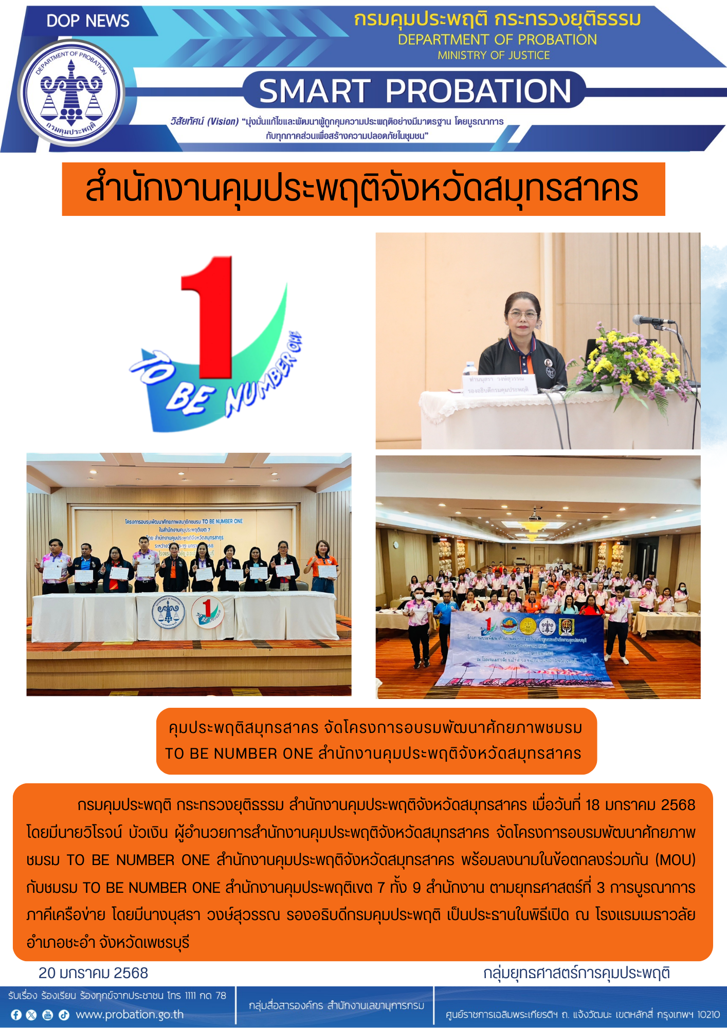 คุมประพฤติสมุทรสาคร จัดโครงการอบรมพัฒนาศักยภาพชมรม TO BE NUMBER ONE สำนักงานคุมประพฤติจังหวัดสมุทรสาคร