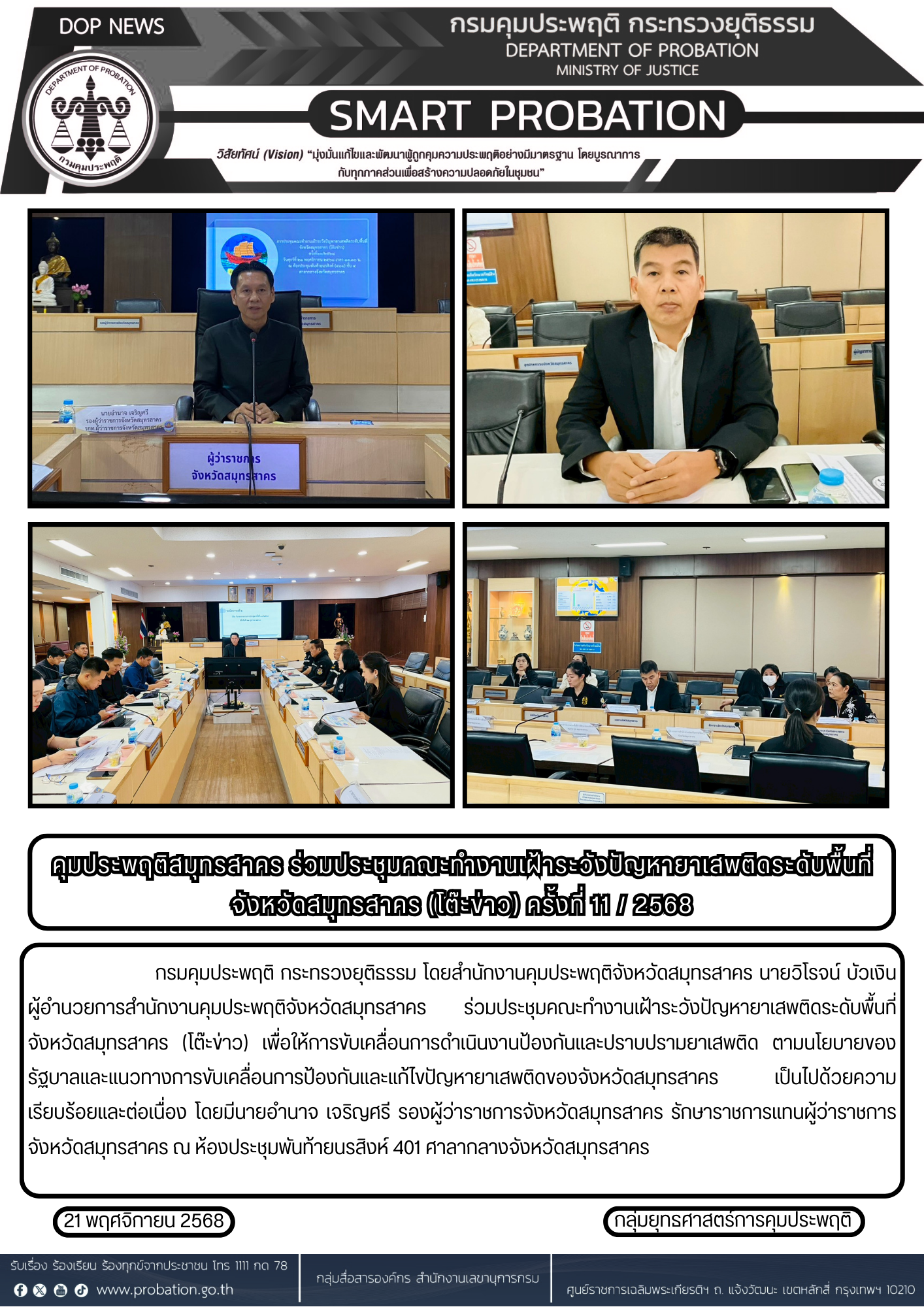 คุมประพฤติสมุทรสาคร ร่วมประชุมคณะทำงานเฝ้าระวังปัญหายาเสพติดระดับพื้นที่จังหวัดสมุทรสาคร (โต๊ะข่าว) ครั้งที่ 11 / 2568