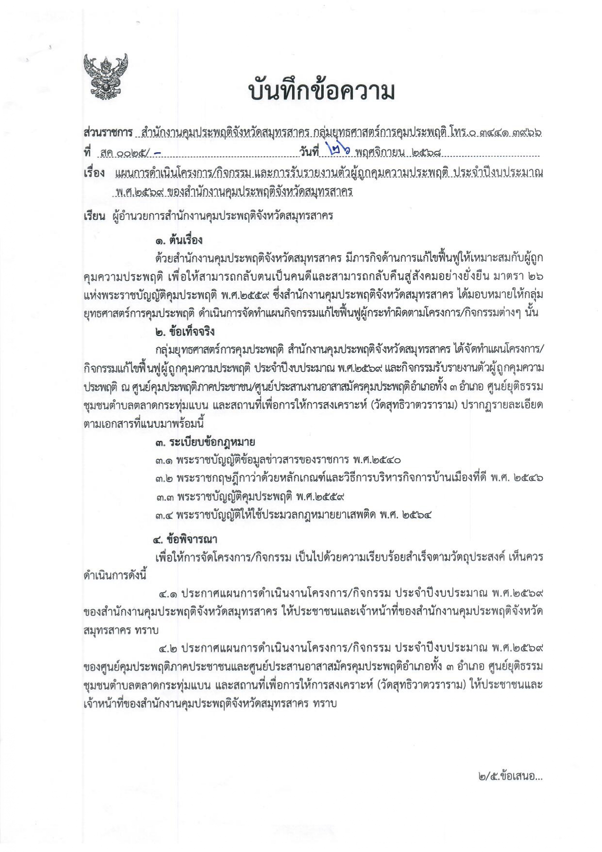 แผนการดำเนินโครงการ/กิจกรรม และการรับรายงานตัวผู้ถูกคุมความประพฤติ ประจำปี พ.ศ. 2569 ของสำนักงานคุมประพฤติจังหวัดสมุทรสาคร