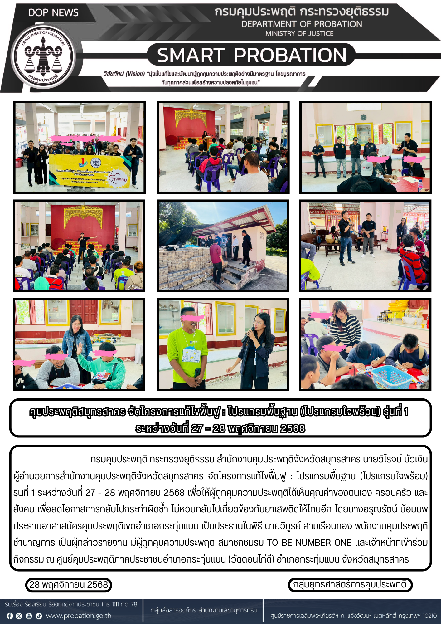 คุมประพฤติสมุทรสาคร จัดโครงการแก้ไขฟื้นฟู : โปรแกรมพื้นฐาน (โปรแกรมใจพร้อม) รุ่นที่ 1 ะหว่างวันที่ 27 - 28 พฤศจิกายน 2568