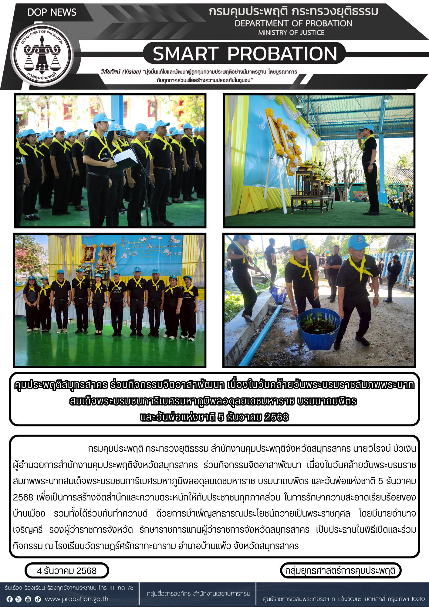 กรมคุมประพฤติ กระทรวงยุติธรรม สำนักงานคุมประพฤติจังหวัดสมุทรสาคร นายวิโรจน์ บัวเงิน ผู้อำนวยการสำนักงานคุมประพฤติจังหวัดสมุทรสาคร ร่วมกิจกรรมจิตอาสาพัฒนา เนื่องในวันคล้ายวันพระบรมราชสมภพพระบาทสมเด็จพระบรมชนกาธิเบศรมหาภูมิพลอดุลยเดชมหาราช บรมนาถบพิตร และวันพ่อแห่งชาติ 5 ธันวาคม 2568 เพื่อเป็นการสร้างจิตสำนึกและความตระหนักให้กับประชาชนทุกภาคส่วน ในการรักษาความสะอาดเรียบร้อยของบ้านเมือง รวมทั้งได้ร่วมกันทำความดี ด้วยการบำเพ็ญสาธารณประโยชน์ถวายเป็นพระราชกุศล