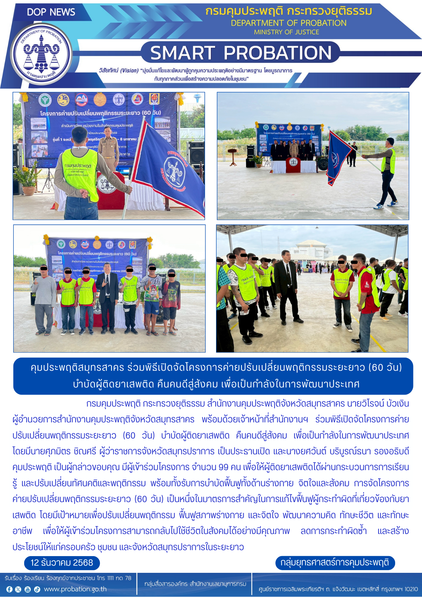 กรมคุมประพฤติ กระทรวงยุติธรรม สำนักงานคุมประพฤติจังหวัดสมุทรสาคร นายวิโรจน์ บัวเงิน ผู้อำนวยการสำนักงานคุมประพฤติจังหวัดสมุทรสาคร พร้อมด้วยเจ้าหน้าที่สำนักงานฯ ร่วมพิธีเปิดจัดโครงการค่ายปรับเปลี่ยนพฤติกรรมระยะยาว (60 วัน) บำบัดผู้ติดยาเสพติด คืนคนดีสู่สังคม เพื่อเป็นกำลังในการพัฒนาประเทศ โดยมีนายศุภมิตร ชิณศรี ผู้ว่าราชการจังหวัดสมุทรปราการ เป็นประธานเปิด และนางยศวันต์ บริบูรณ์ธนา รองอธิบดีคุมประพฤติ เป็นผู้กล่าวขอบคุณ มีผู้เข้าร่วมโครงการ จำนวน 99 คน เพื่อให้ผู้ติดยาเสพติดได้ผ่านกระบวนการการเรียนรู้ และปรับเปลี่ยนทัศนคติและพฤติกรรม พร้อมทั้งรับการบำบัดฟื้นฟูทั้งด้านร่างกาย จิตใจและสังคม การจัดโครงการค่ายปรับเปลี่ยนพฤติกรรมระยะยาว (60 วัน) เป็นหนึ่งในมาตรการสำคัญในการแก้ไขฟื้นฟูผู้กระทำผิดที่เกี่ยวข้องกับยาเสพติด โดยมีเป้าหมายเพื่อปรับเปลี่ยนพฤติกรรม ฟื้นฟูสภาพร่างกาย และจิตใจ พัฒนาความคิด ทักษะชีวิต และทักษะอาชีพ เพื่อให้ผู้เข้าร่วมโครงการสามารถกลับไปใช้ชีวิตในสังคมได้อย่างมีคุณภาพ ลดการกระทำผิดซ้ำ และสร้างประโยชน์ให้แก่ครอบครัว ชุมชน และจังหวัดสมุทรปราการในระยะยาว