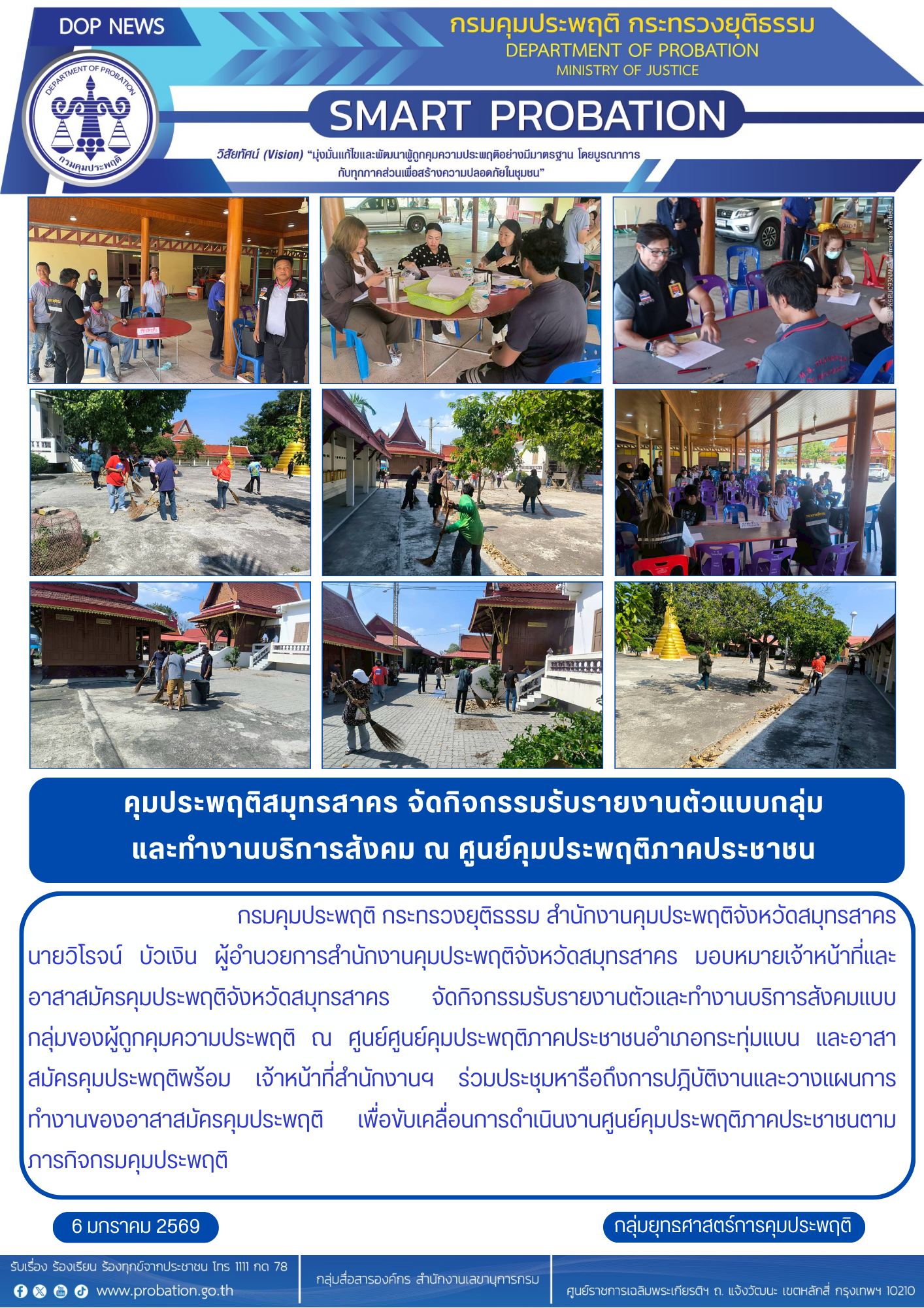 กรมคุมประพฤติ กระทรวงยุติธรรม สำนักงานคุมประพฤติจังหวัดสมุทรสาคร นายวิโรจน์ บัวเงิน ผู้อำนวยการสำนักงานคุมประพฤติจังหวัดสมุทรสาคร มอบหมายเจ้าหน้าที่และอาสาสมัครคุมประพฤติจังหวัดสมุทรสาคร จัดกิจกรรมรับรายงานตัวและทำงานบริการสังคมแบบกลุ่มของผู้ถูกคุมความประพฤติ ณ ศูนย์ศูนย์คุมประพฤติภาคประชาชนอำเภอกระทุ่มแบน และอาสาสมัครคุมประพฤติพร้อม เจ้าหน้าที่สำนักงานฯ ร่วมประชุมหารือถึงการปฎิบัติงานและวางแผนการทำงานของอาสาสมัครคุมประพฤติ เพื่อขับเคลื่อนการดำเนินงานศูนย์คุมประพฤติภาคประชาชนตามภารกิจกรมคุมประพฤติ